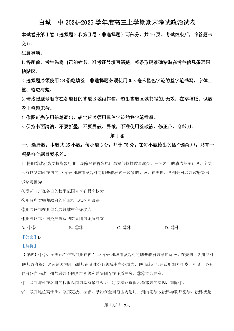 吉林省白城市第一中学2025届高三上学期1月期末考试政治(精品解析版)