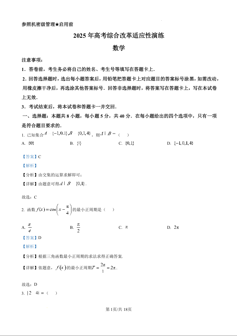新八省联考2025年高考综合改革适应性演练数学(精品解析版)