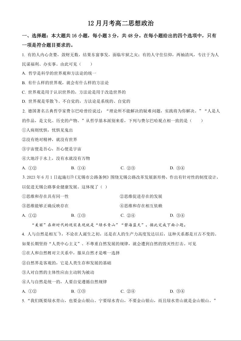 河北省沧州市六校联考2024-2025学年高二上学期12月月考政治(原卷版)
