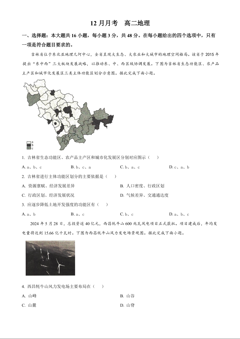 河北省沧州市六校联考2024-2025学年高二上学期12月月考地理(原卷版)