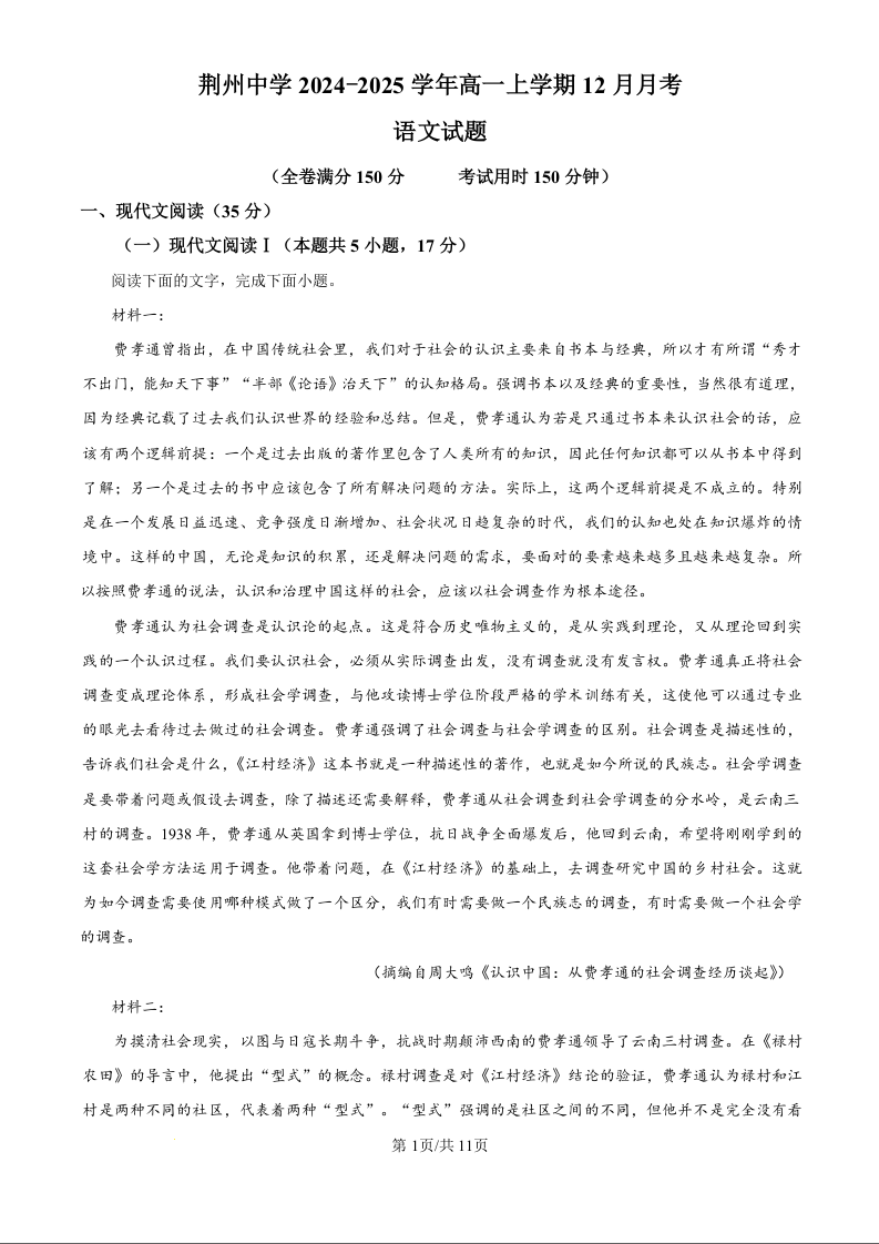 湖北省荆州中学2024-2025学年高一上学期12月月考语文(原卷版)