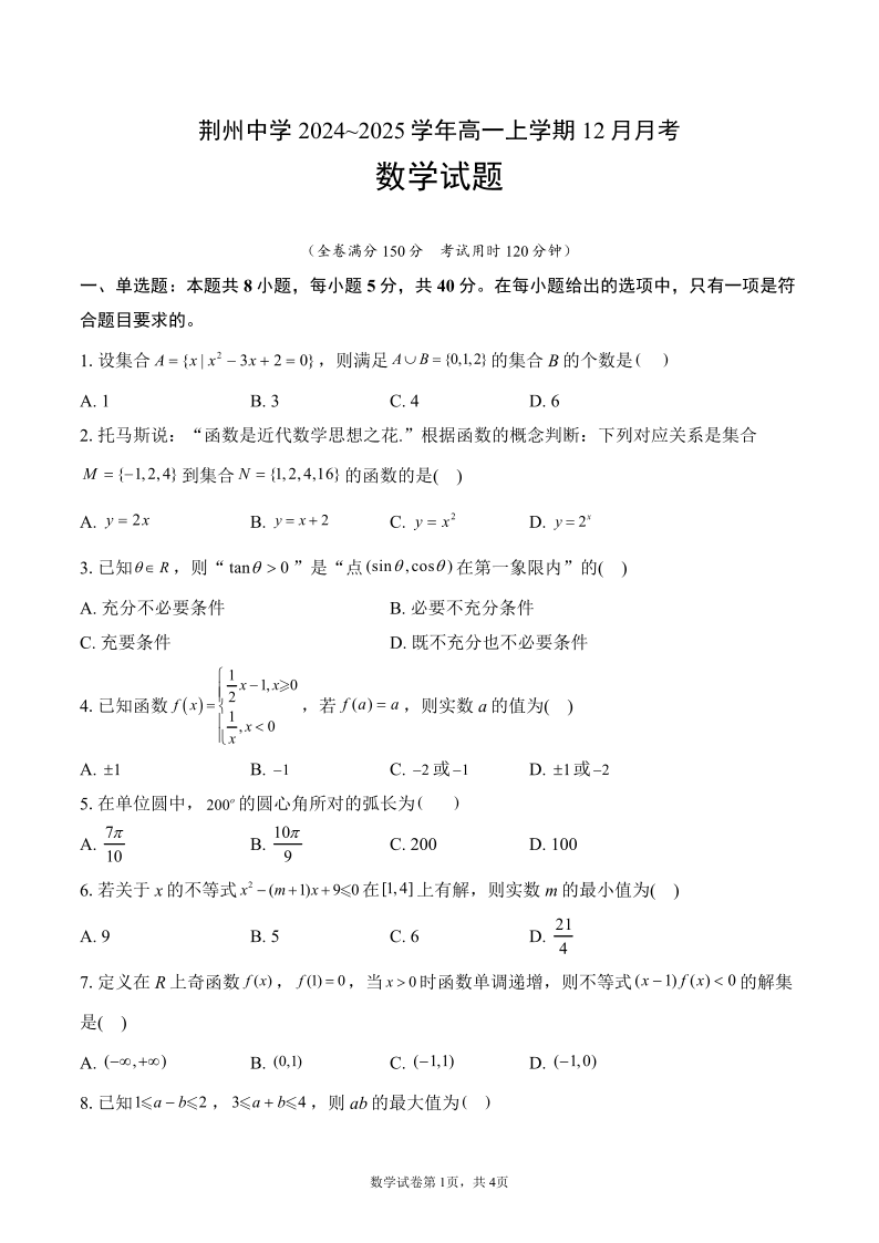 湖北省荆州中学2024-2025学年高一上学期12月月考数学