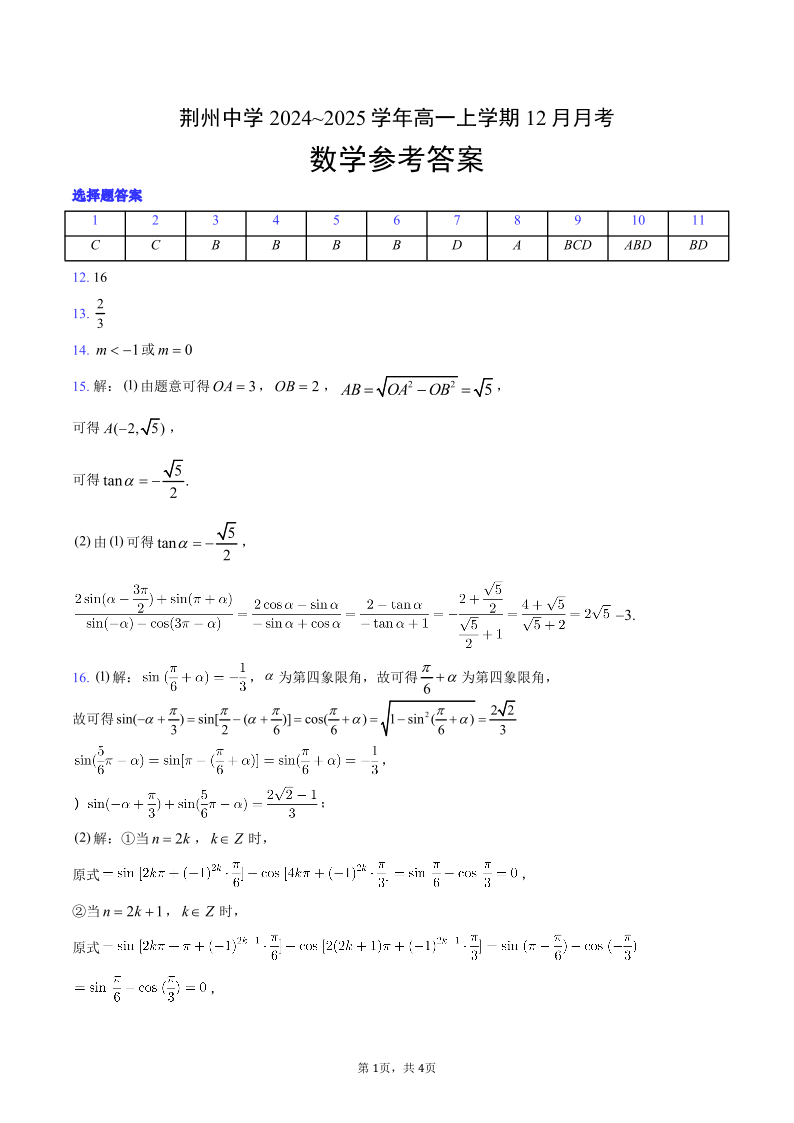 湖北省荆州中学2024-2025学年高一上学期12月月考数学答案