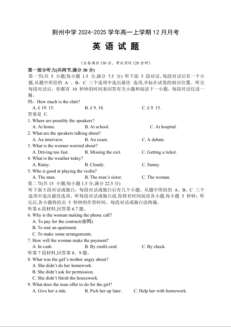 湖北省荆州中学2024-2025学年高一上学期12月月考英语