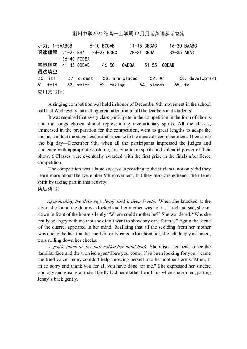 湖北省荆州中学2024-2025学年高一上学期12月月考英语答案