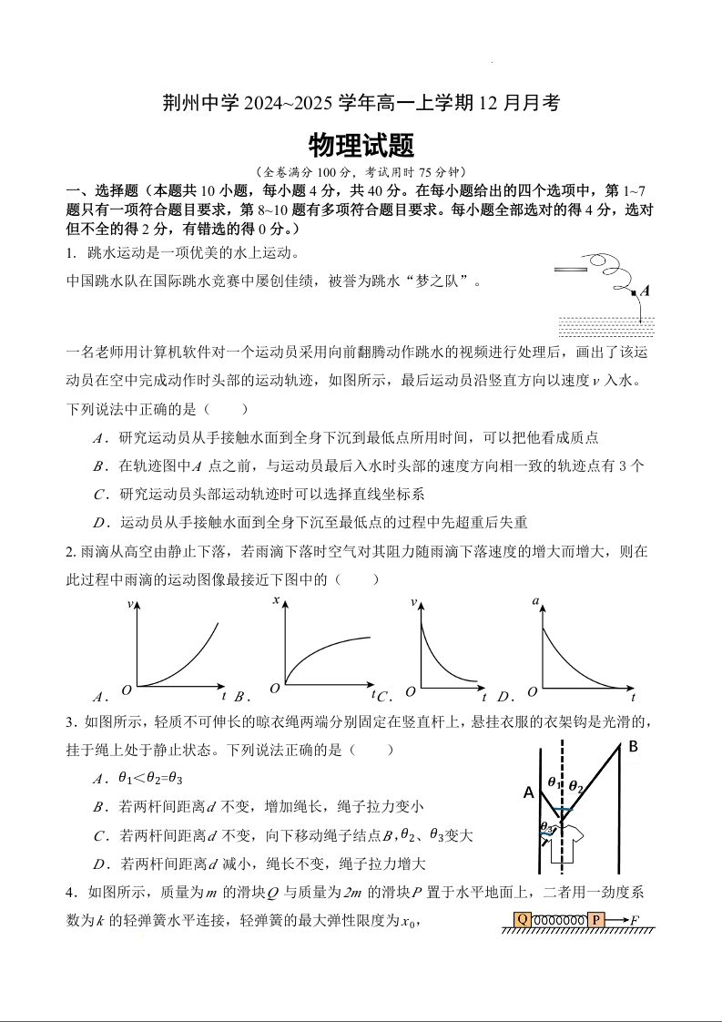 湖北省荆州中学2024-2025学年高一上学期12月月考物理
