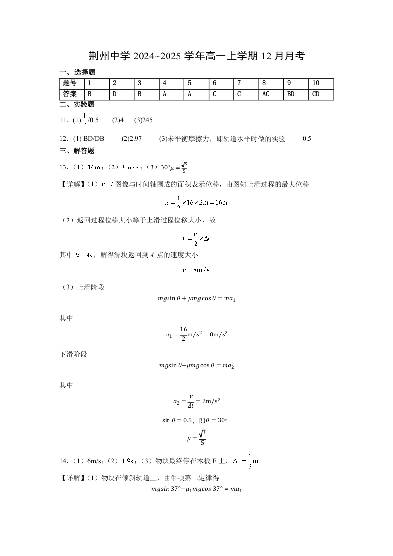 湖北省荆州中学2024-2025学年高一上学期12月月考物理答案
