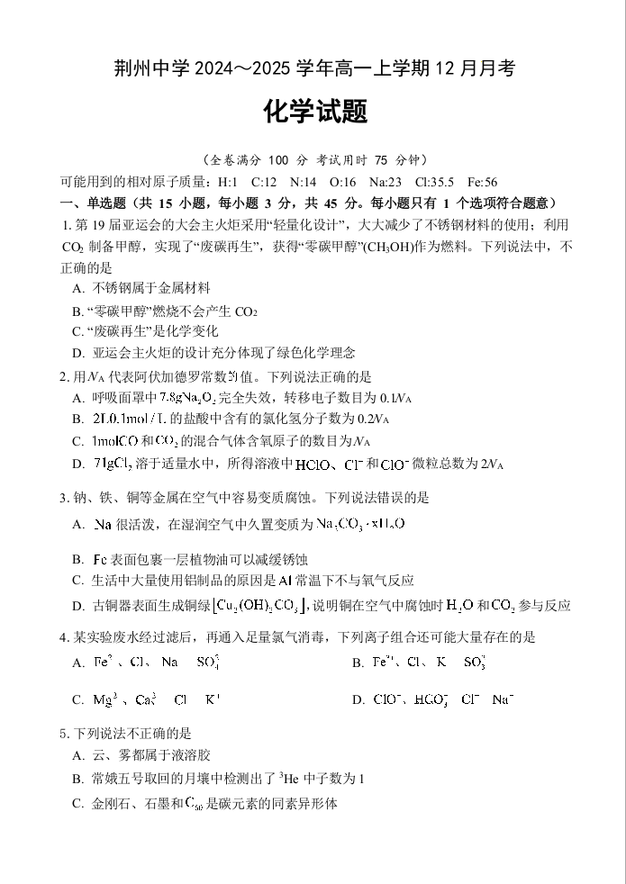 湖北省荆州中学2024-2025学年高一上学期12月月考化学