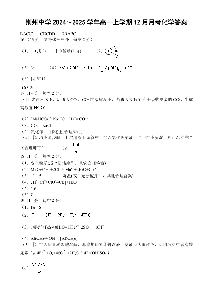 湖北省荆州中学2024-2025学年高一上学期12月月考化学答案