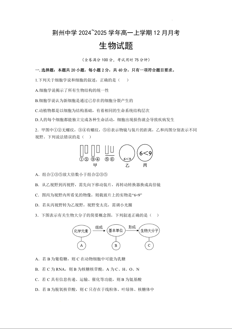 湖北省荆州中学2024-2025学年高一上学期12月月考生物