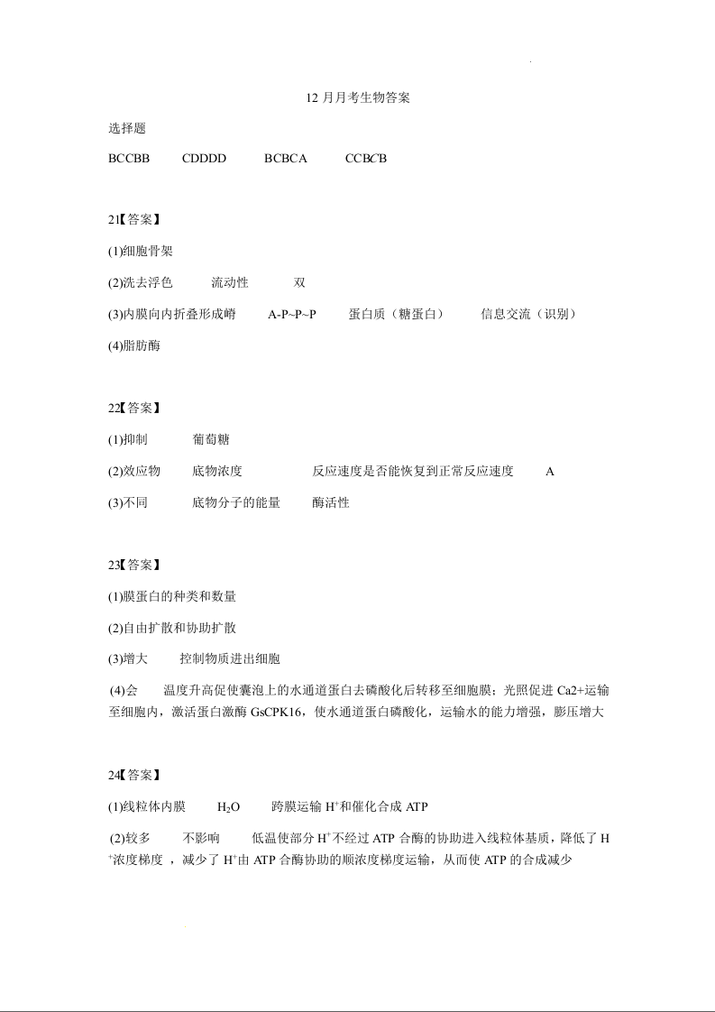 湖北省荆州中学2024-2025学年高一上学期12月月考生物答案