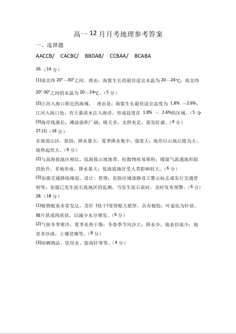 湖北省荆州中学2024-2025学年高一上学期12月月考地理答案