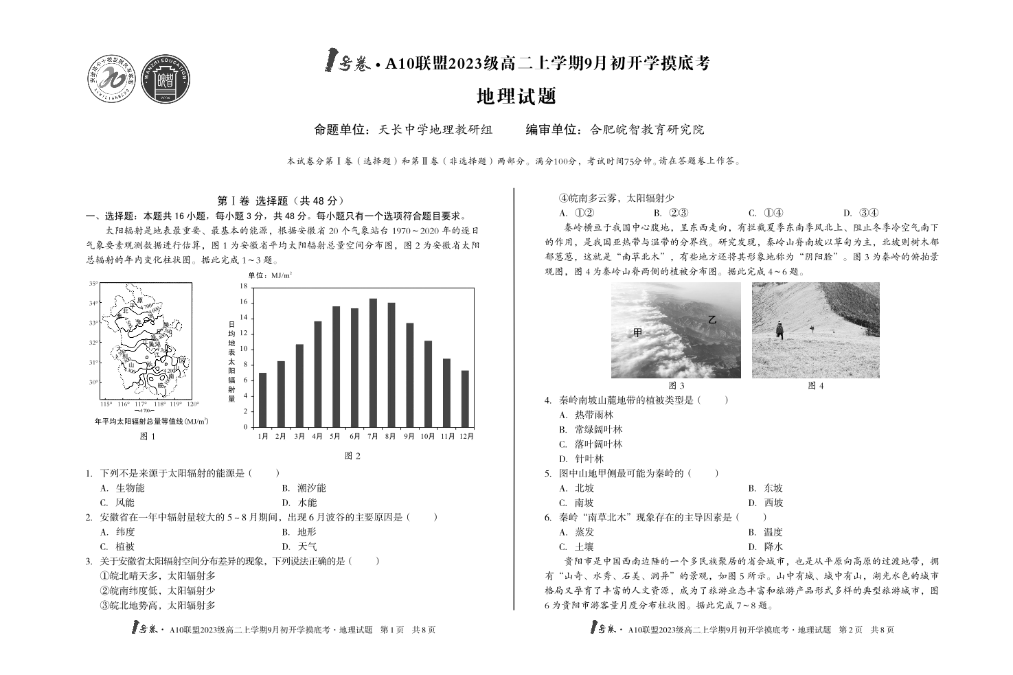 安徽省1号卷·A10联盟2023级高二上学期9月初开学摸底考地理