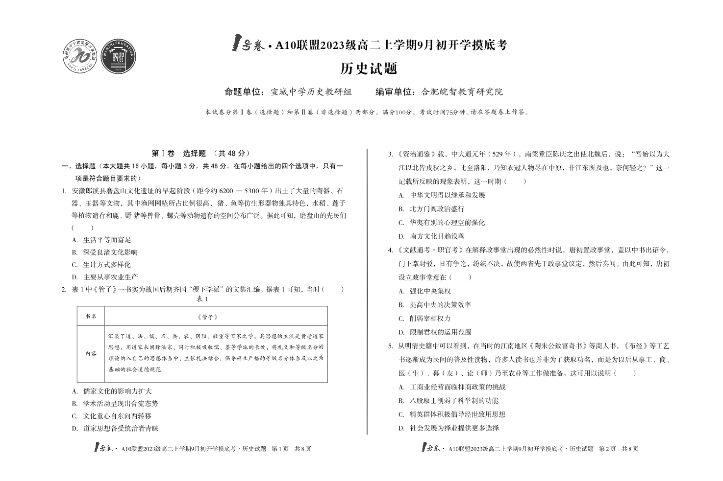 安徽省1号卷·A10联盟2023级高二上学期9月初开学摸底考历史