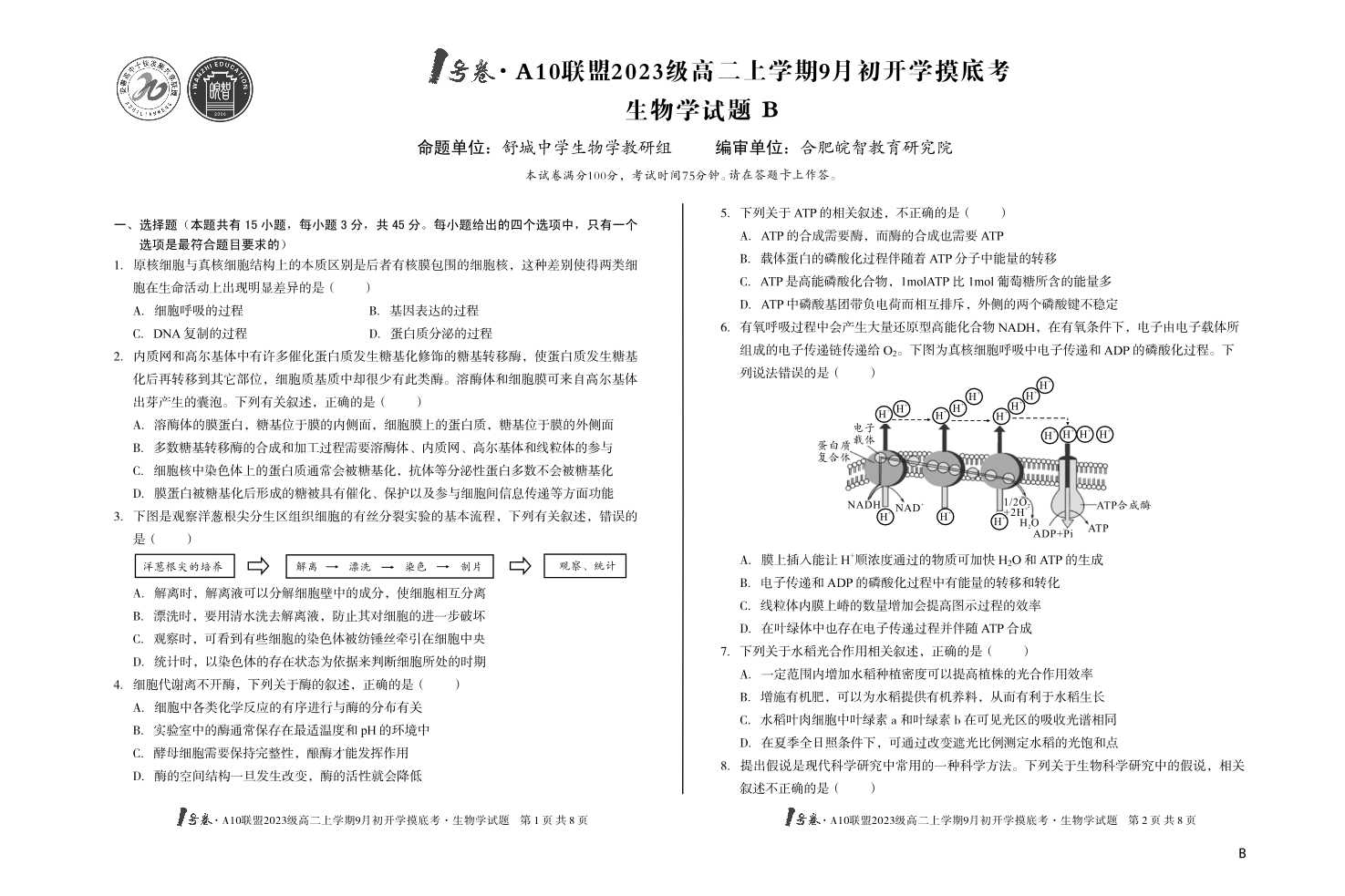 安徽省1号卷·A10联盟2023级高二上学期9月初开学摸底考生物(B卷)