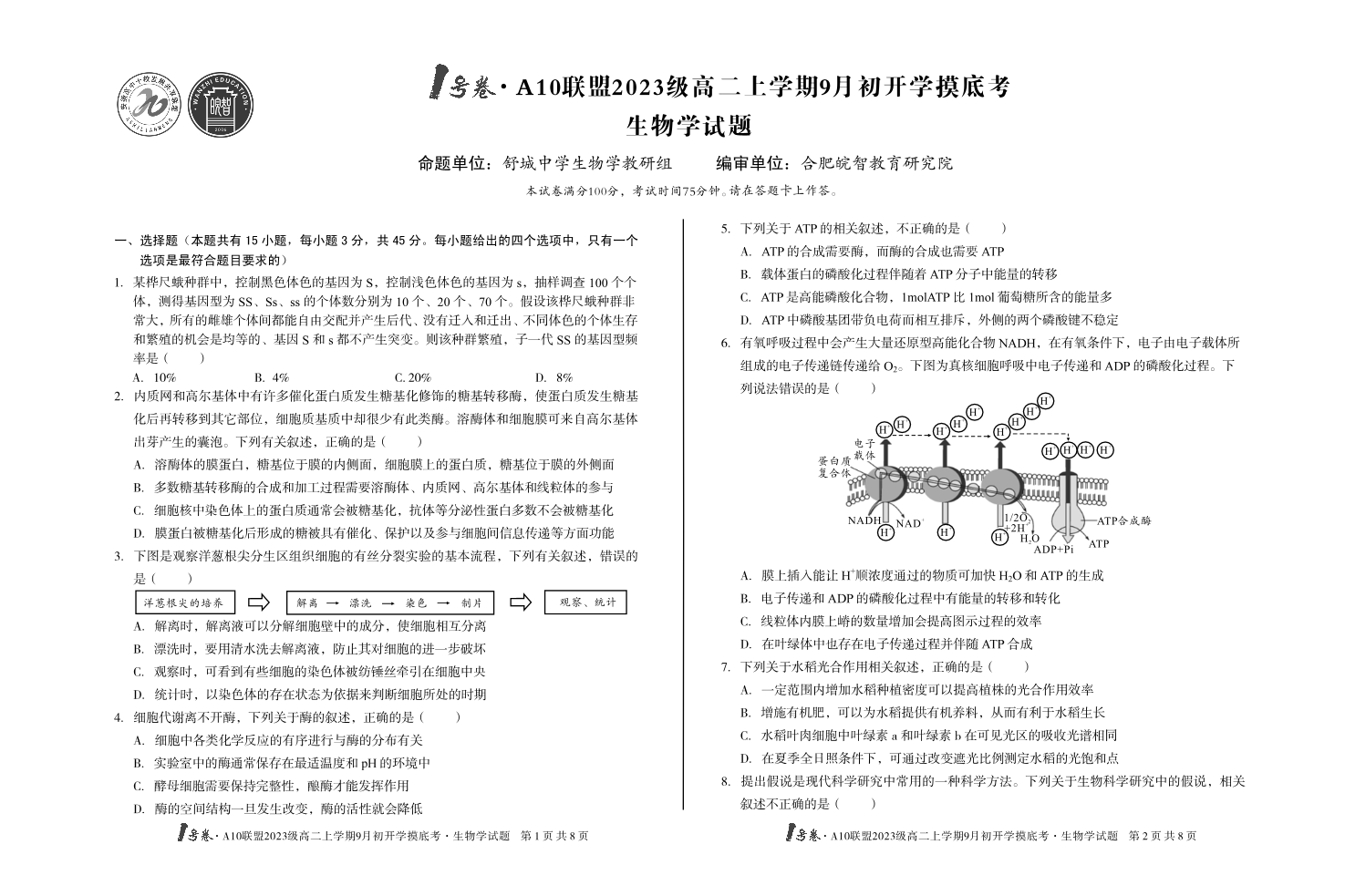 安徽省1号卷·A10联盟2023级高二上学期9月初开学摸底考生物