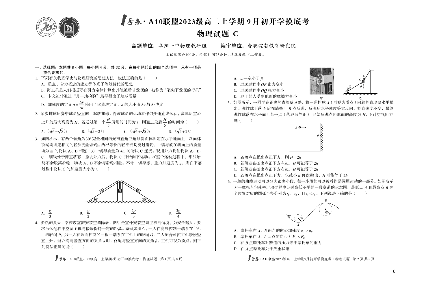 安徽省1号卷·A10联盟2023级高二上学期9月初开学摸底考物理(C卷)