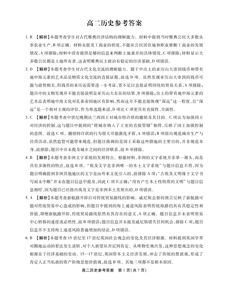 安徽省部分学校2024-2025学年高二上学期开学考试历史答案