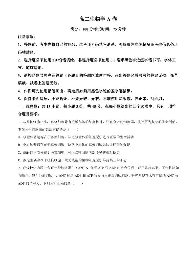 安徽省部分学校2024-2025学年高二上学期开学考试生物+答案