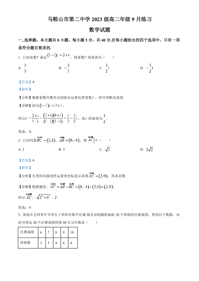 安徽省马鞍山市第二中学2023级高二年级9月练习数学(解析版)