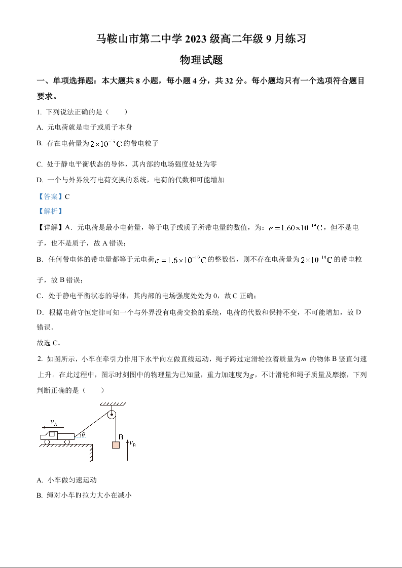 安徽省马鞍山市第二中学2023级高二年级9月练习物理(原卷版)