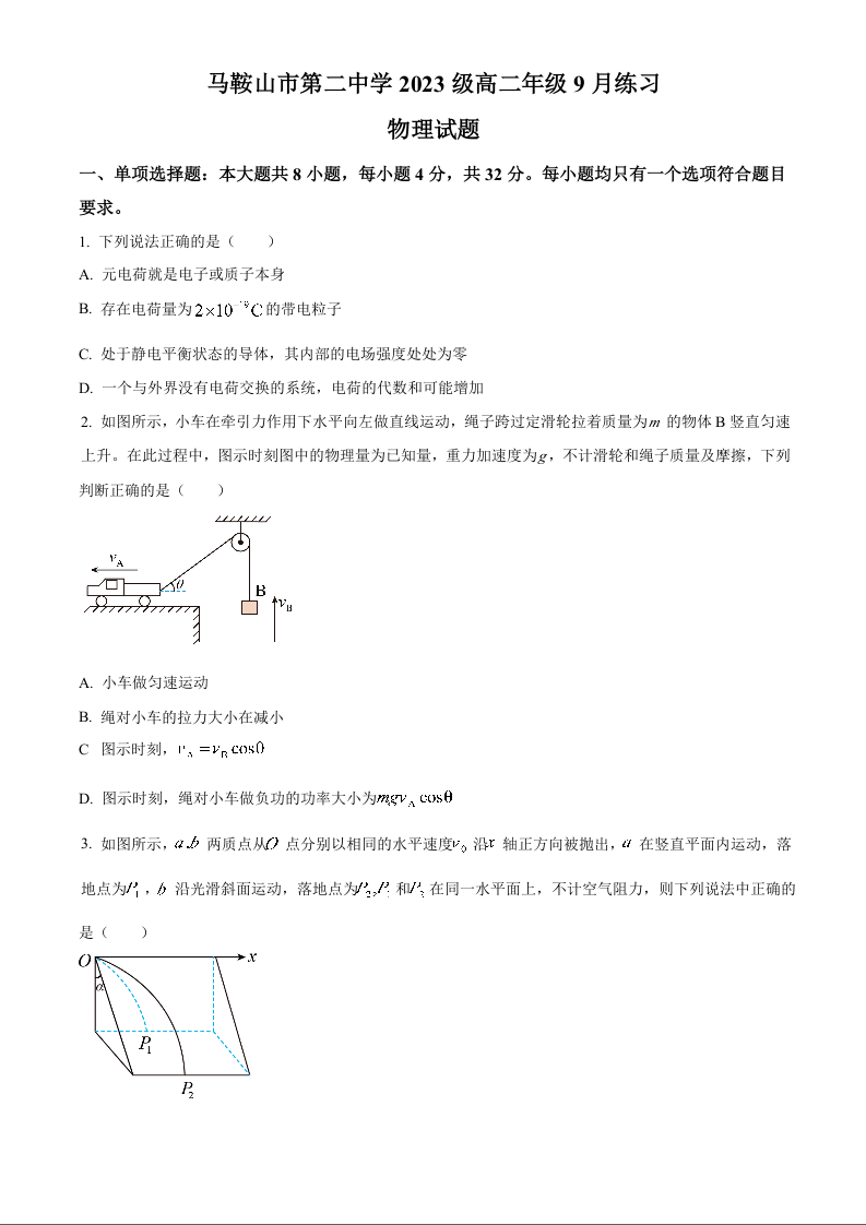 安徽省马鞍山市第二中学2023级高二年级9月练习物理(解析版)