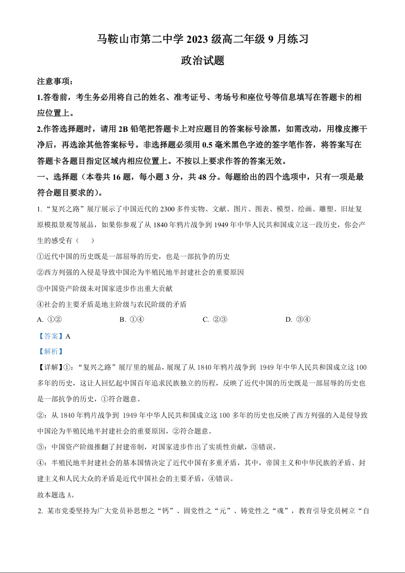 安徽省马鞍山市第二中学2023级高二年级9月练习政治(解析版)
