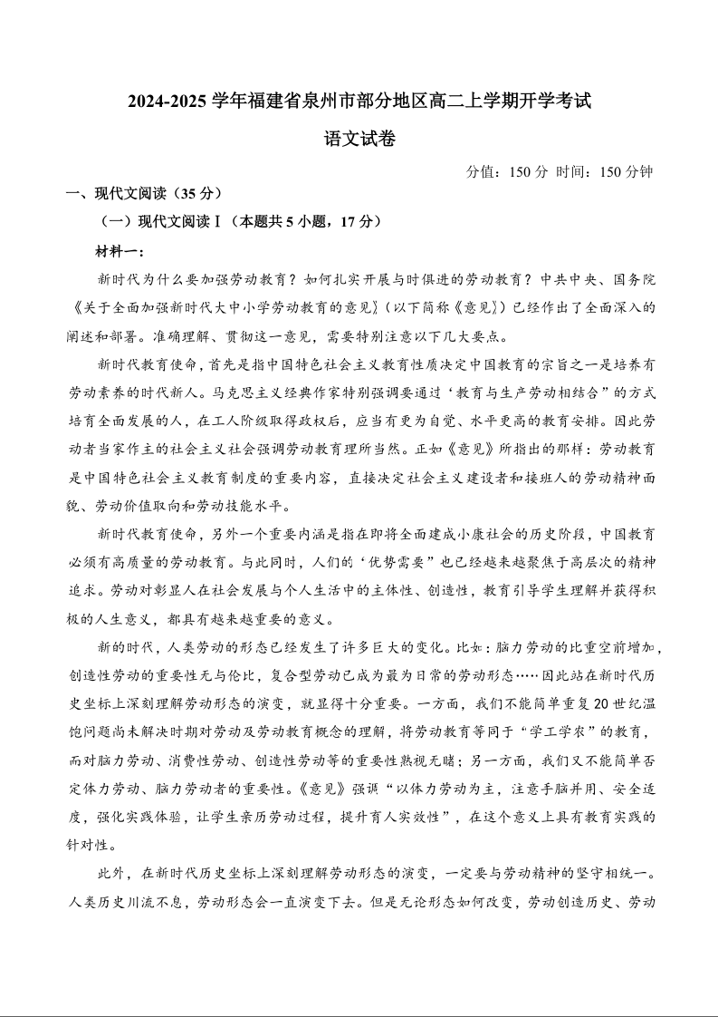 福建省泉州市部分地区2024-2025学年高二上学期开学考试语文+答案