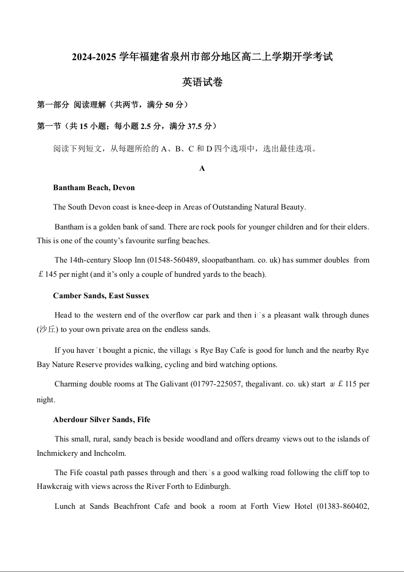 福建省泉州市部分地区2024-2025学年高二上学期开学考试英语+答案
