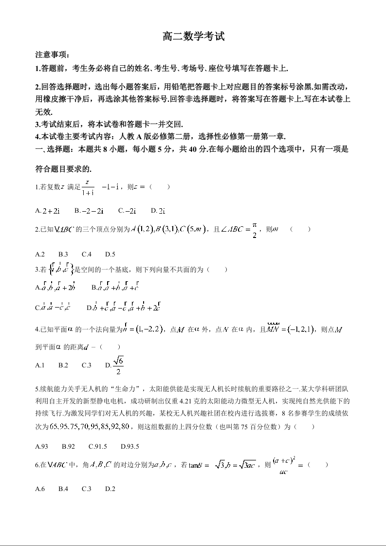 河北省保定市部分高中2024-2025学年高二上学期开学考试数学+答案