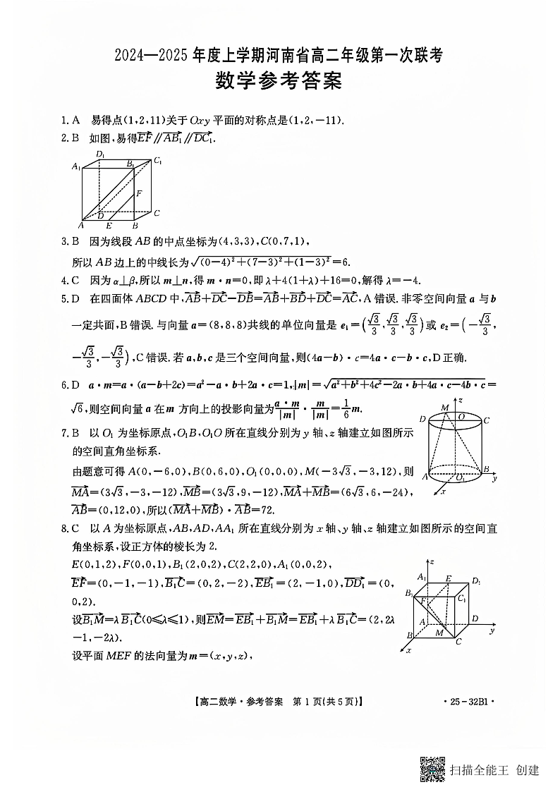 河南省部分学校2024-2015年度上学期高二年级第一次联考数学答案