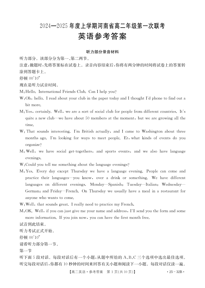 河南省部分学校2024-2015年度上学期高二年级第一次联考英语答案