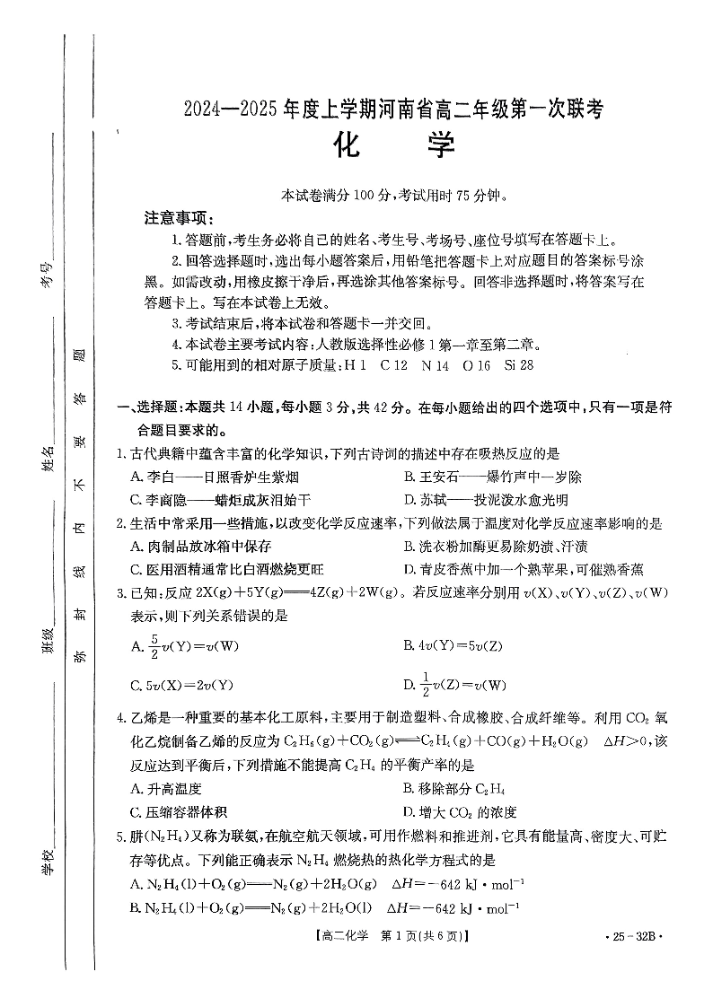 河南省部分学校2024-2015年度上学期高二年级第一次联考化学