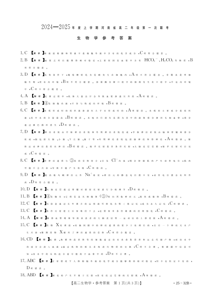 河南省部分学校2024-2015年度上学期高二年级第一次联考生物答案