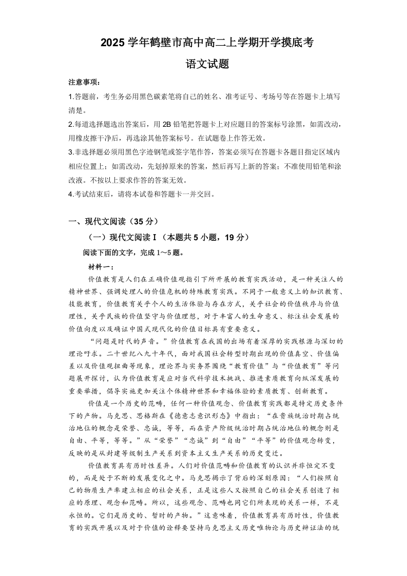 河南省鹤壁市高中2024-2025学年高二上学期开学摸底考试语文+答案