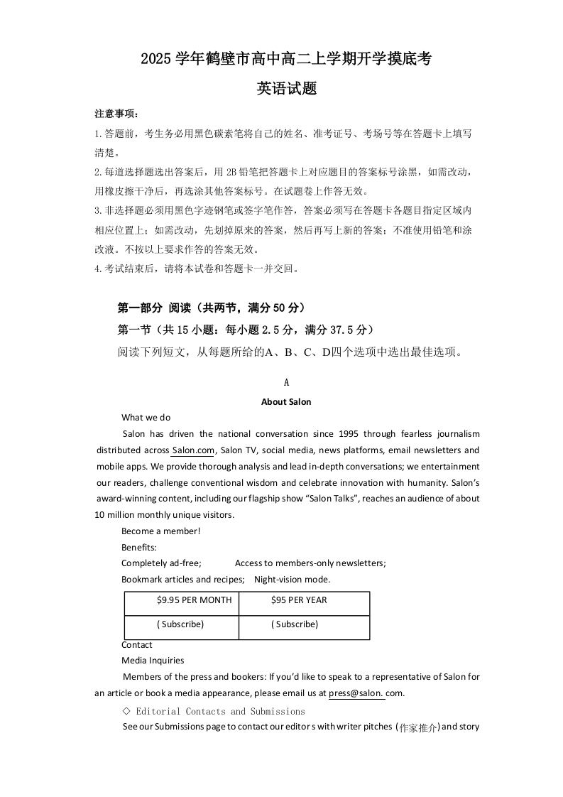 河南省鹤壁市高中2024-2025学年高二上学期开学摸底考试英语+答案