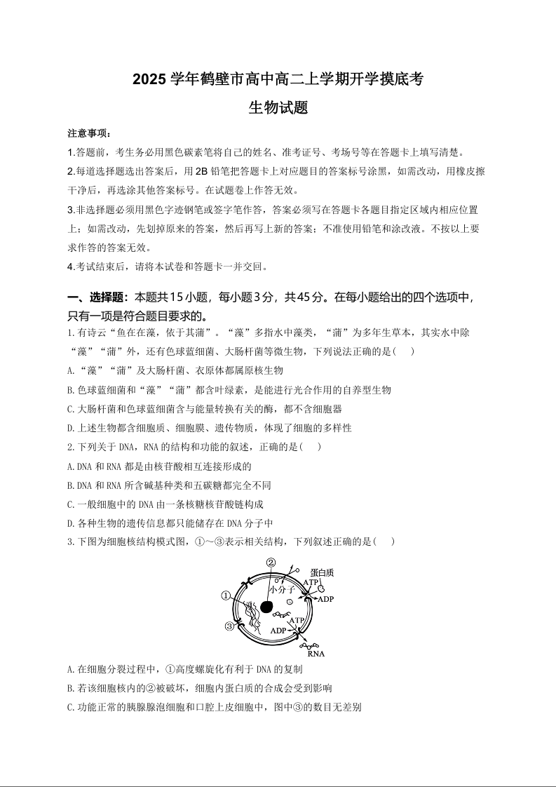 河南省鹤壁市高中2024-2025学年高二上学期开学摸底考试生物+答案