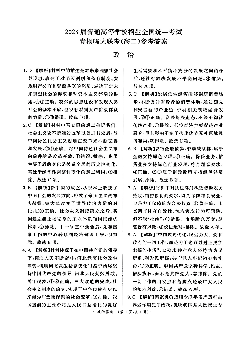 河南省青桐鸣大联考2024-2025学年高二上学期开学考试政治答案