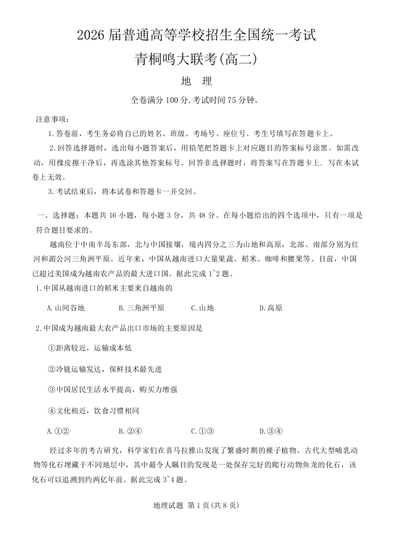 河南省青桐鸣大联考2024-2025学年高二上学期开学考试地理