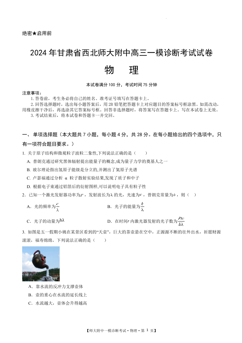 甘肃省西北师范大学附属中学2025届高三上学期一模诊断考试物理+答案