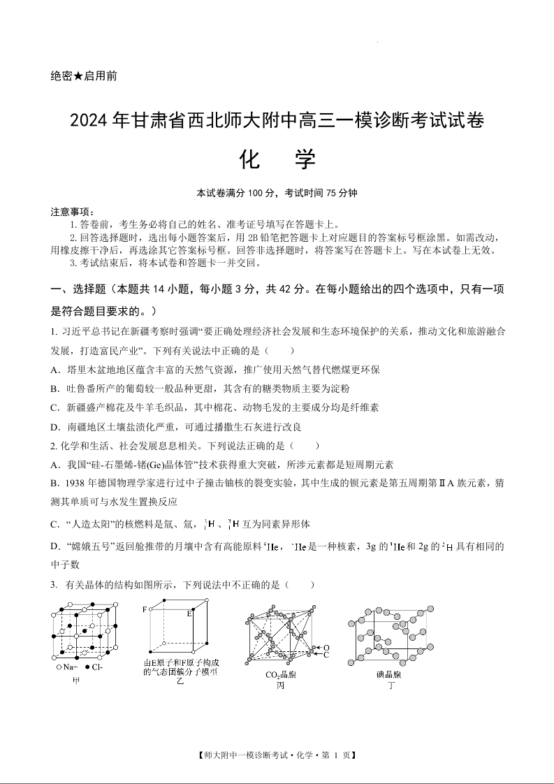 甘肃省西北师范大学附属中学2025届高三上学期一模诊断考试化学+答案