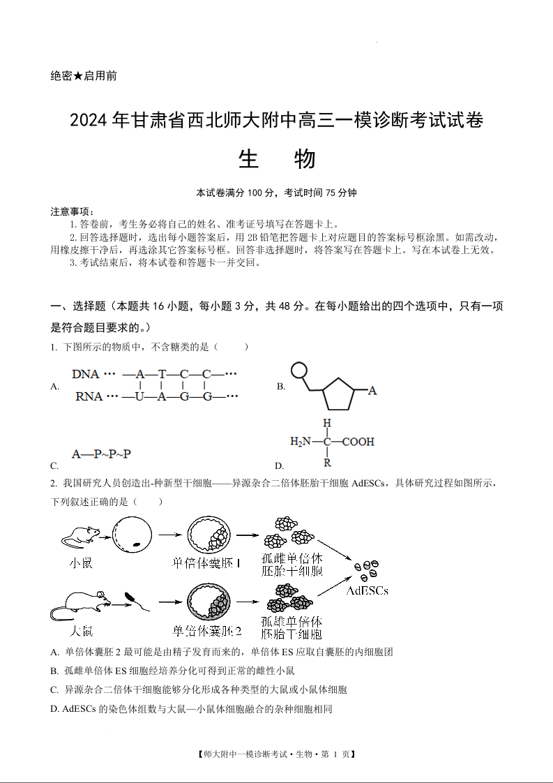 甘肃省西北师范大学附属中学2025届高三上学期一模诊断考试生物+答案