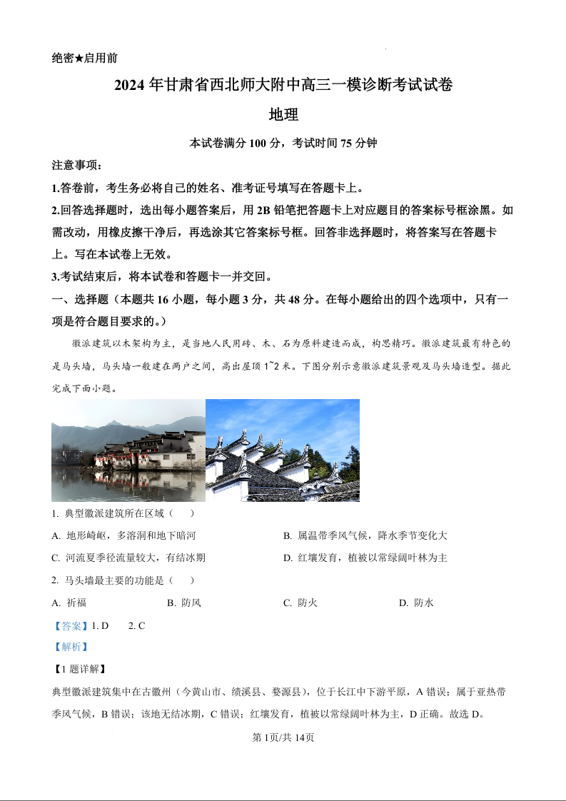 甘肃省西北师范大学附属中学2025届高三上学期一模诊断考试地理(精品解析版)