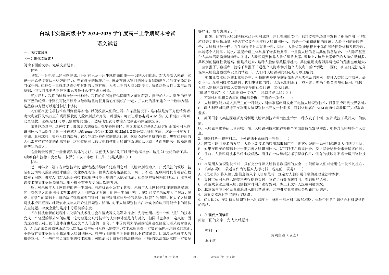 吉林省白城市实验高级中学2025届高三上学期1月期末考试语文+答案