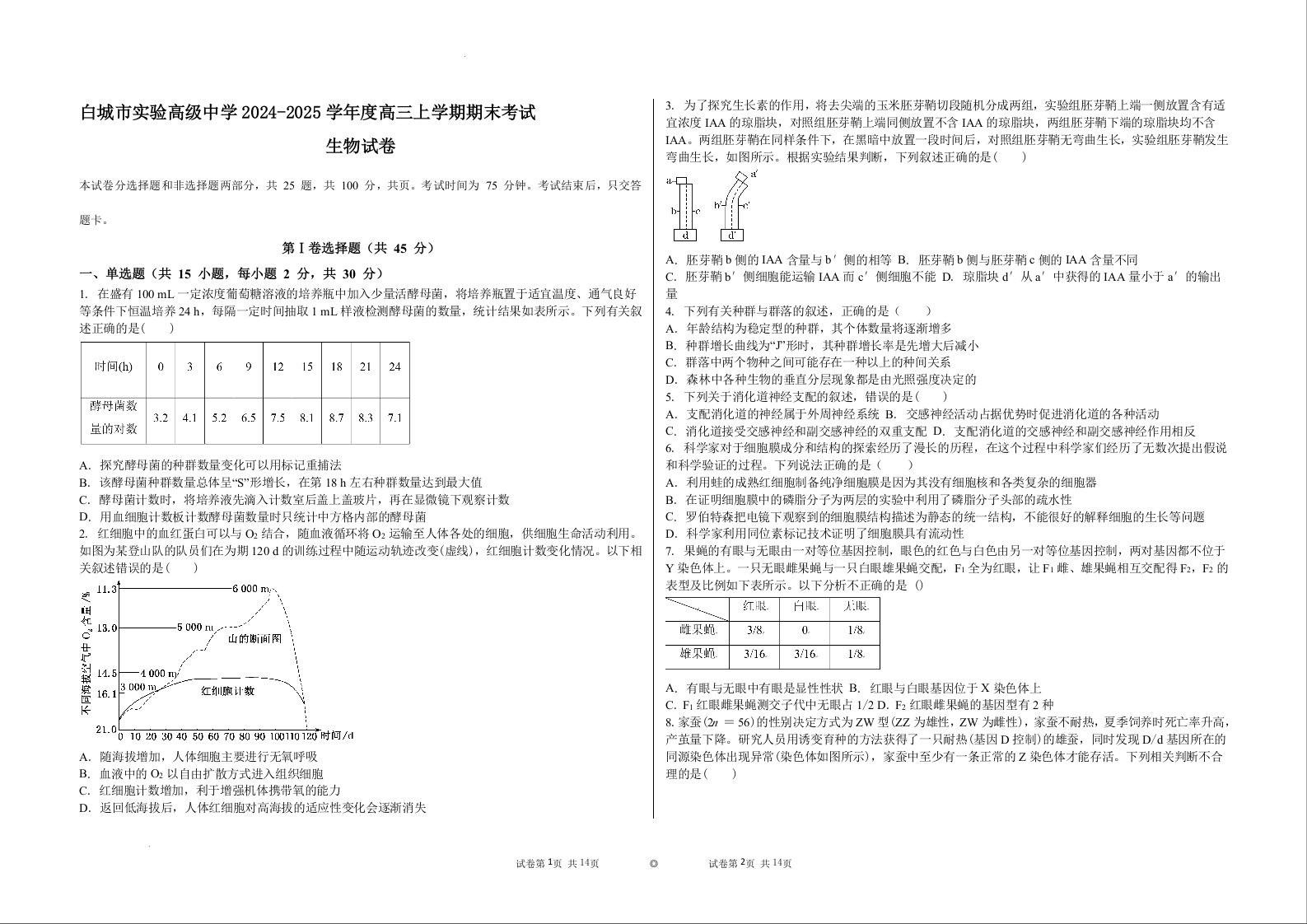 吉林省白城市实验高级中学2025届高三上学期1月期末考试生物+答案