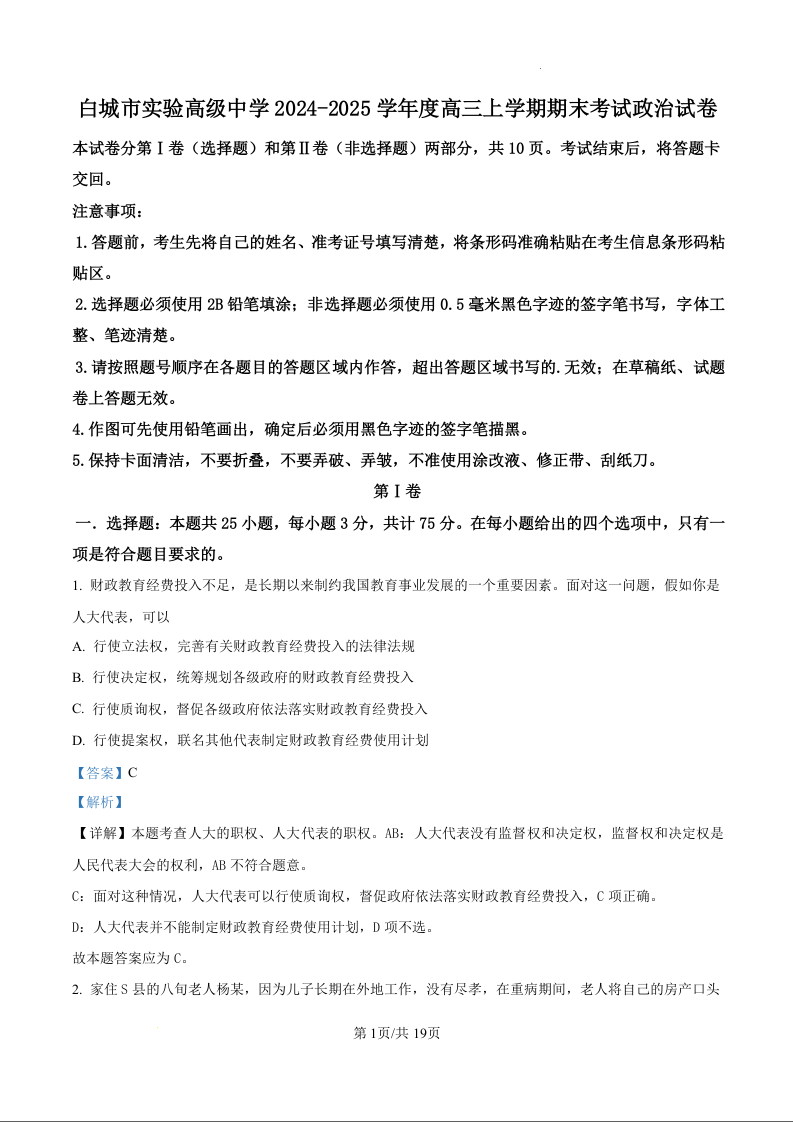 吉林省白城市实验高级中学2025届高三上学期1月期末考试政治(精品解析版)
