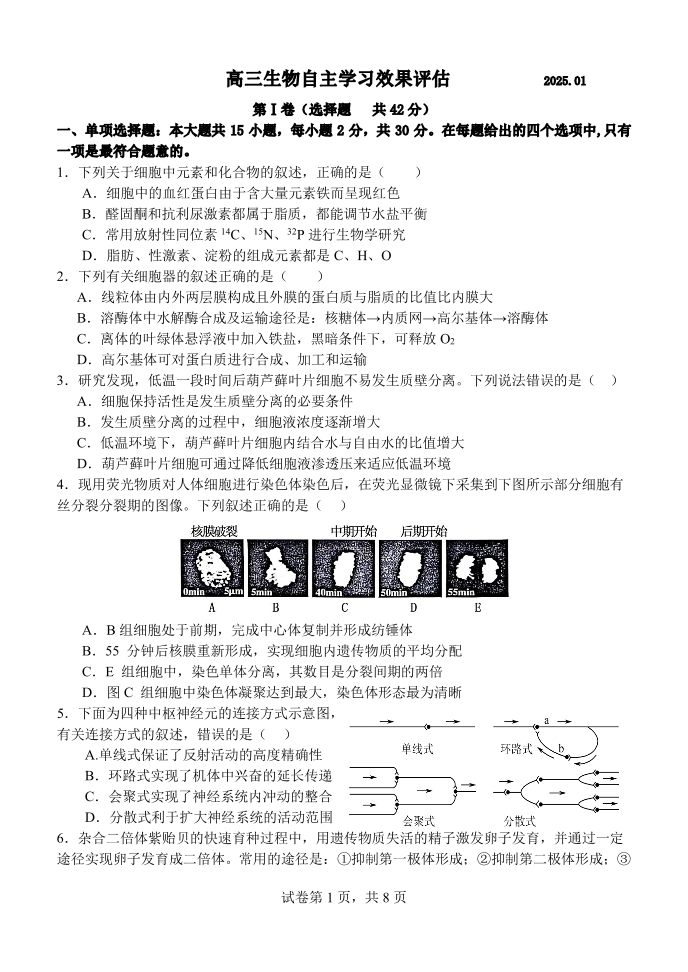江苏省扬州中学2025届高三上学期1月月考生物+答案