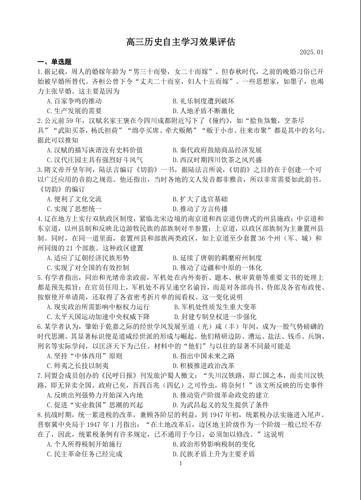 江苏省扬州中学2025届高三上学期1月月考历史+答案