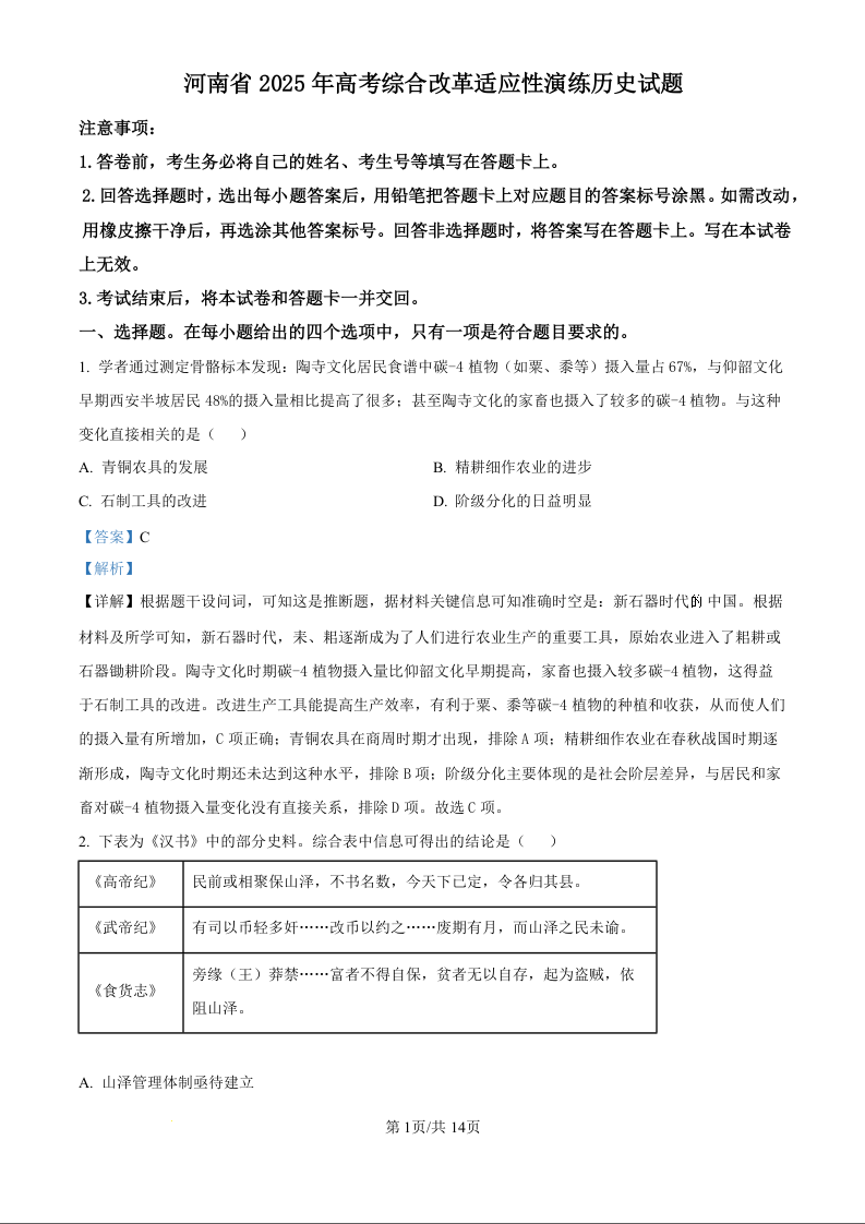 新八省联考2025年河南省高考综合改革适应性演练历史(精品解析版)