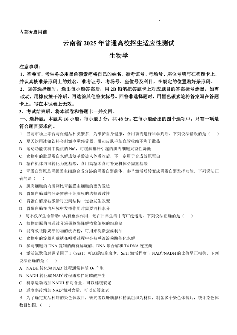 新八省联考2025年云南省高考综合改革适应性演练生物